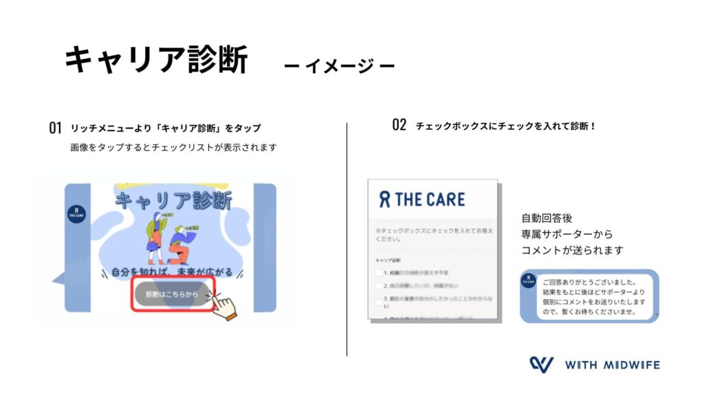 伊藤:そうなんです。毎月の相談件数は一件あるかないか。たくさんあることがいいわけではないですが、おそらく悩んでいる方は実際はもう少しいるはずで、どうしたらもっと身近に感じてもらえるかなと悩んでいた時に、LINEでも相談できる「THE CARE」を知りました。LINEは電話と比べてとても身近な存在ですし、かつWith Midwifeさんもスタートアップだからこその相性の良さもあると思い、導入に至りました。